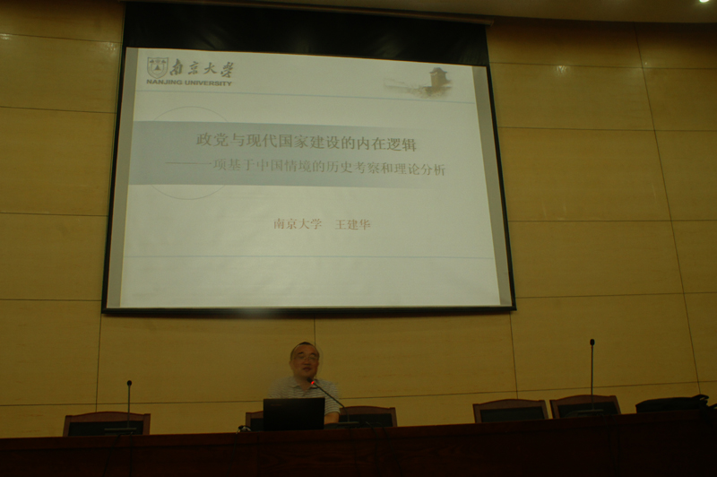 王建华教授从“为什么民初政党推行的西方宪政民主失败?为什么国民党军政、训政、宪政的救国方案走入困境?中国共产党解决这一问题的理论建构与路径选择是什么?”三个问题引入,进而对中国近代政党与国家建设的历史演进及其理论进行深入浅出的阐述,提出作为“整体”的政党和作为“部分”的政党理论新观点,从理论上阐释了中国共产党建设现代国家的正确路径选择。他指出从民族国家到民主国家需要经历一个过程,不同阶段国家建设也要采取不同的路径选择。王建华教授渊博的知识,幽默风趣的语言,赢得了与会师生的热烈掌声。