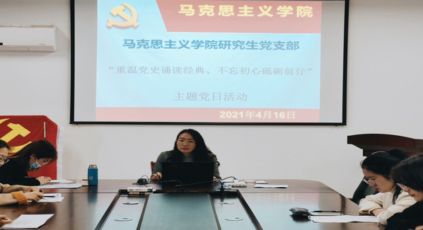 为庆祝中国共产党成立100周年,深入推进党史学习教育,传承红色基因和革命精神,4月16日下午,公司研究生党支部在文科楼330会议室开展了“重温党史诵读经典、不忘初心命砥砺前行”主题党日活动,活动由公司研究生党支部书记刘凤娟老师主持。
