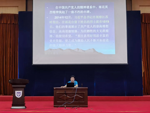 习近平总书记于2014年12月在江苏考察时指出:“雨花台是新民主主义革命时期中国共产党人和爱国志士最为集中的殉难地,在雨花台留下姓名的烈士就有1519名。他们的事迹展示了共产党人的崇高理想信念、高尚道德情操、为民牺牲的大无畏精神。要注意用好用活丰富的党史资源,使之成为激励人民不断开拓前进的强大精神力量”。该讲座向同学们介绍了有代表性的雨花英烈的感人故事:丁香:带着腹中骨肉,依然走向刑场;丁行:潜伏敌人“心脏”,送出多封情报;曹顺标:19岁,他为信仰舍弃生命和爱情;陈君起:大家闺秀投身革命,狱中绘梅花明志;李耘生:敌人抱来幼子探监,逼他暴露身份;杨振铎:狱中密建党支部,开辟斗争新战场;胡廷俊:战场上失去右腿,靠假肢送出情报;刘亚生:子弹从头顶飞过,他毫不畏惧;石璞:17岁,他把青春热血抛洒在雨花台;孙津川:拒绝营救,母子分梨慷慨赴死;冷少农:潜伏何应钦身边,牺牲12年家人才知道;郭凤韶:送行时夺过船票,代同志冒险赴宁;邓中夏:用生命捍卫“职业革命者”的初心 ;杨峻德:名校高材生投身革命,组织闽北武装斗争;胡秉铎:放弃荣华富贵,为信仰慨然赴死;顾衡:放弃数学家梦,参加革命;袁咨桐:16岁,他成为雨花台最年轻烈士;毛福轩:他跟随毛泽东走上革命道路;谭寿林:北大高材生投身革命气如虹;陈处泰:胡乔木为他题词“浩气长存”。该讲座图文并茂、视频感人,许多雨花英烈的事迹深深感动了在场的每一位同学,是一次生动的党课,增强了同学们爱党爱国的情怀。