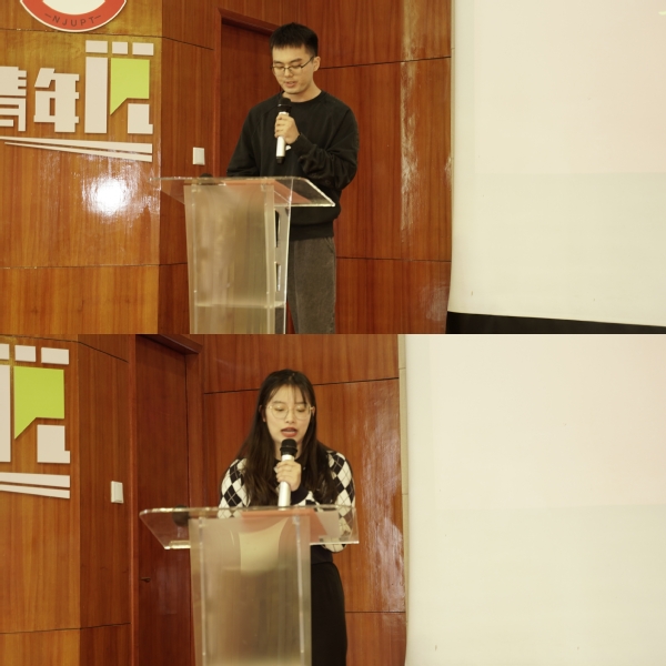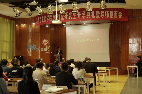 研究生老生代表卫明皓同学从老生的角度给新生介绍了南邮优美的学习环境和丰富的学习资源,结合专业特点对所学专业的学习提出相关建议:希望同学们在马院浓厚的学术氛围中,开拓进取,勇于创新,努力成为堪当民族复兴重任的时代新人。