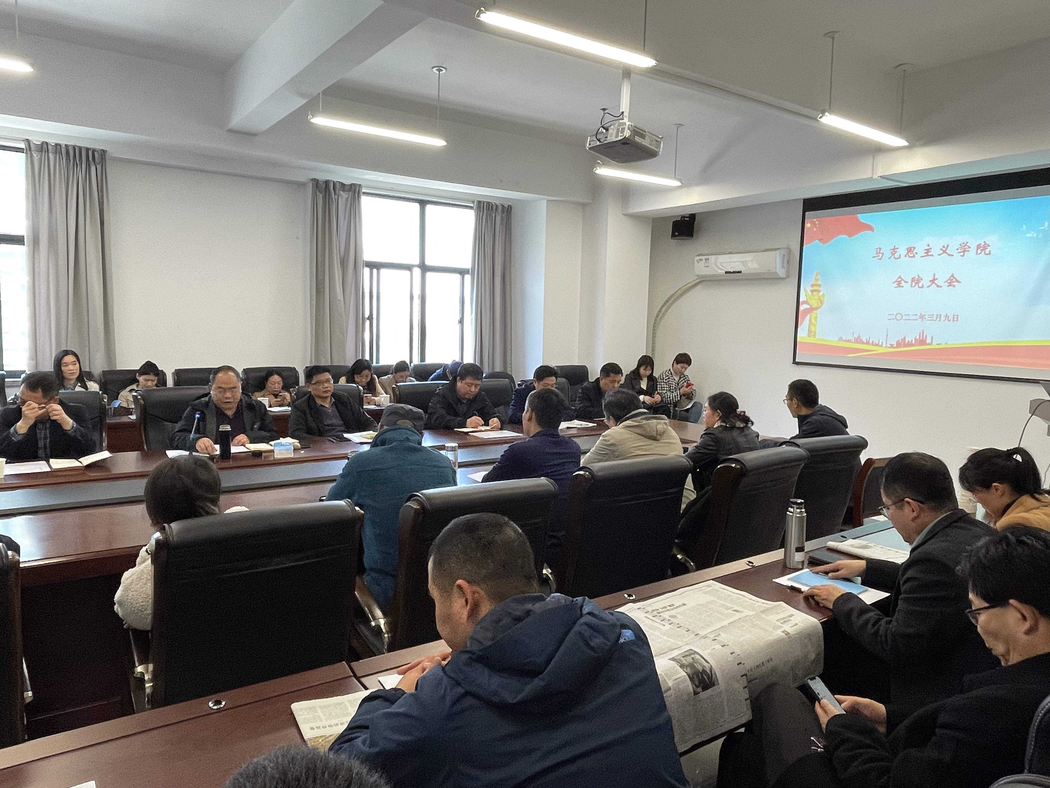 最后,沈召前书记作总结讲话。沈书记指出,2022年是具有重要意义的一年,党的二十大即将召开,公司也即将迎来八十周年校庆。我们要深刻认识“两个确立”的决定性意义,自觉增强“四个意识”、坚定“四个自信”、做到“两个维护”,弘扬伟大建党精神,以党建引领马院高质量发展。开学以来公司各项工作平稳运行,下面要着重做好以下几方面工作。一是做好政治巡察整改。全院要提高政治站位、强化政治担当,把巡察整改作为一项严肃的政治任务、政治责任,高度负责尽责、抓紧抓实抓好,确保巡察反馈意见真正落实落地;二是部署组织生活会和开展民主评议党员工作。根据公司要求,要做好组织生活会和开展民主评议党员工作,公司党政班子成员要以普通党员身份参加所在支部的组织生活会;三是部署全面从严治党专题会和意识形态专题会工作。公司将于近期召开全面从严治党专题会和意识形态专题会,并对全面从严治党及党风廉政建设工作、师德师风建设、意识形态工作等进行部署。沈书记最后强调,马院老师要落实好立德树人根本任务,真正把思政课上好,规范教学,严守师德师风底线,做到“在马言马,在马信马,在马爱马”。全院教职工要有高度的使命感和忧患意识,提振精气神,严格要求自己,全力冲刺公司马理论学科博士点申报。