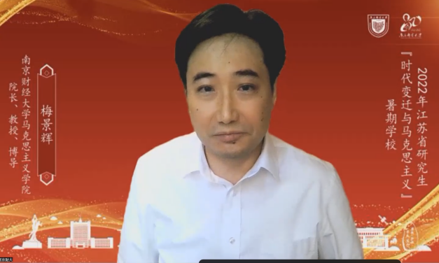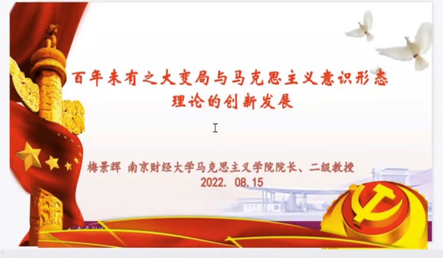 8月15日下午,南京财经大学必威西汉姆联经理梅景辉教授以《百年未有之大变局与马克思主义意识形态理论的创新发展》为题,从百年未有之大变局与“卡夫丁峡谷”的跨越、马克思主义意识形态理论的思想溯源及其历史发展、马克思主义意识形态在中国化历程中的创新发展三方面展开,并简要概述了当前意识形态领域存在的主要问题,政治性、学理性、针对性强。