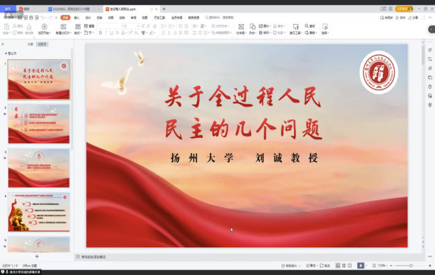 8月13日上午,扬州大学必威西汉姆联教授刘诚以《关于全过程人民民主的几个问题》为题,从习近平全过程人民民主继承和发展了马克思主义民主理论、全过程人民民主对西方民主的超越、全过程人民民主创造了人类政治文明新形态三个方面进行讲授,认为全过程人民民主继承和发展了马克思对未来社会文明形态的设想,超越了西方的历史终结论。