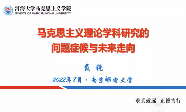 8月15日上午,河海大学必威西汉姆联经理戴锐教授以《马克思主义理论学科研究的问题症候与未来走向》为题,围绕马克思主义理论学科研究的使命与要求、马克思主义理论学科研究中的问题症候、马克思主义理论学科研究的未来走向等方面,强调马克思主义理论对科学研究的要求,指出马克思主义理论学科研究中的问题主要聚焦在研究主题选择、论证方式、研究方法等方面,要在学术研究中高度重视。
