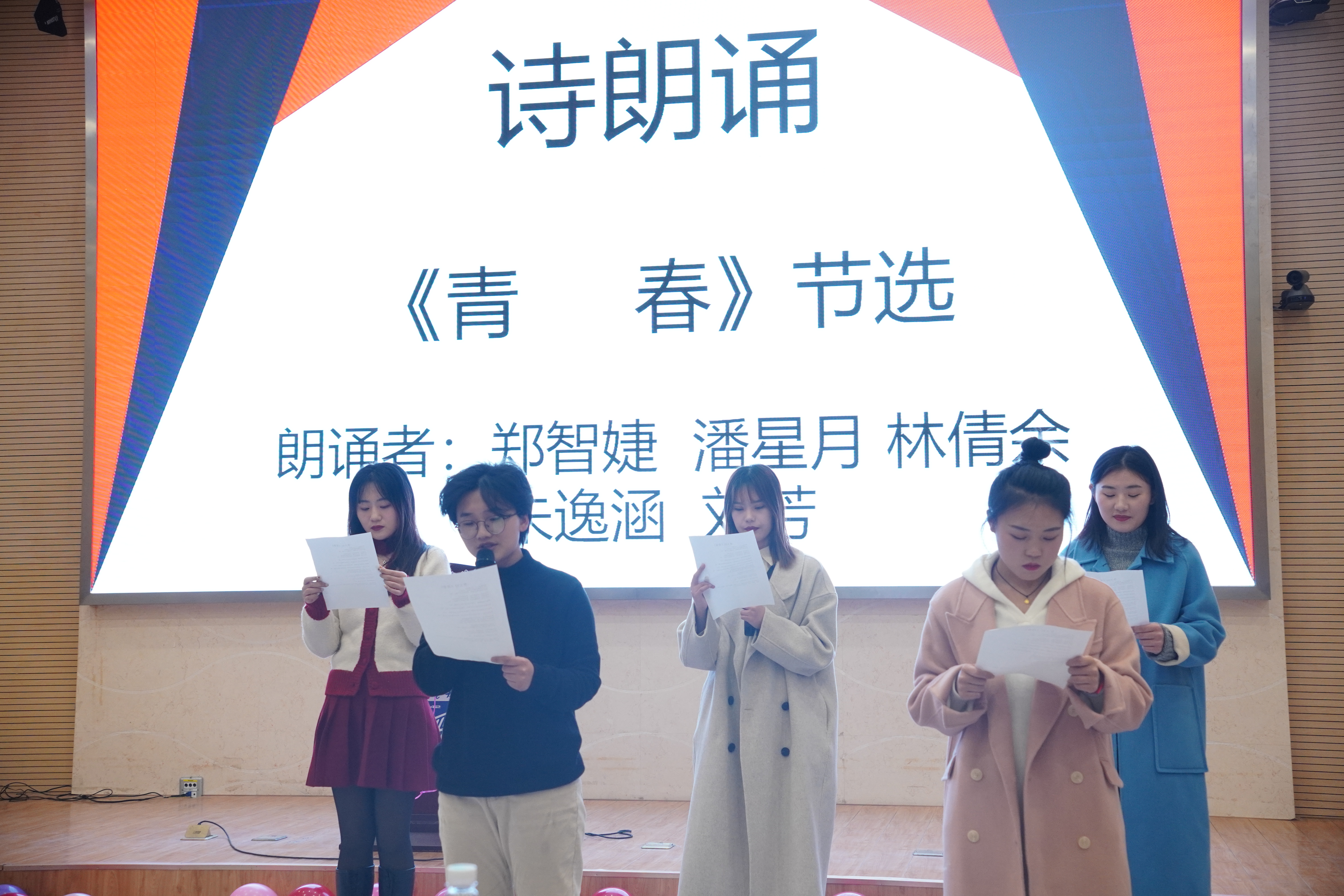材料公司的王宁、邾珊(女)同学演唱了歌曲《小酒窝》,烘托了现场气氛。最后必威西汉姆联郑智婕(女)、刘芳(女)、潘星月(女)、林倩余(女)、朱逸涵(女)为我们带来诗朗诵《青春》节选,在场研究生同学产生了共鸣。