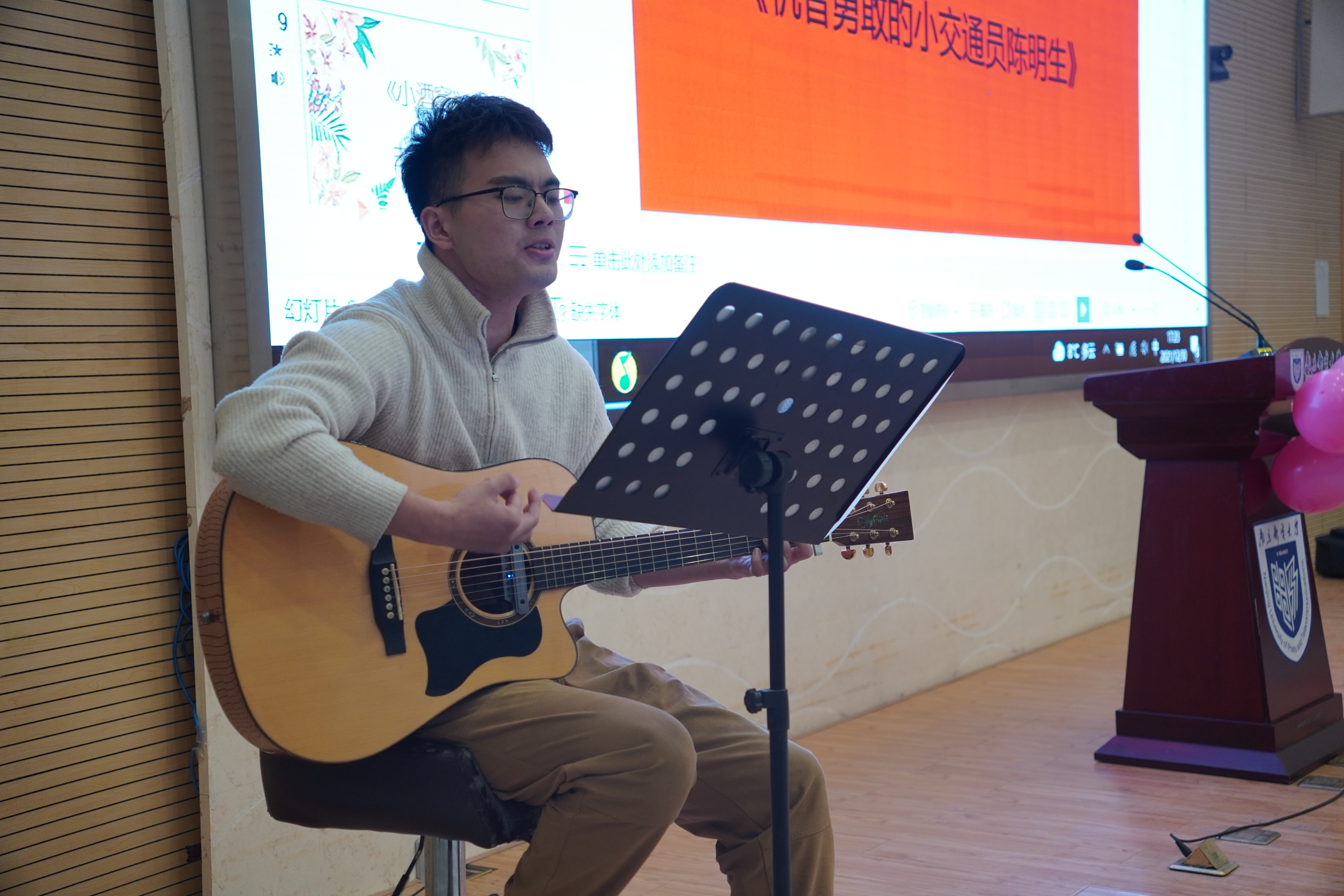 材料公司于海鹏、唐瑾(女)两位同学为我们演唱了歌曲《告白气球》,为活动进行了暖场。必威西汉姆联卫明皓同学为我们弹唱了歌曲《春夏秋冬的你》,歌声令现场的观众陶醉其中。