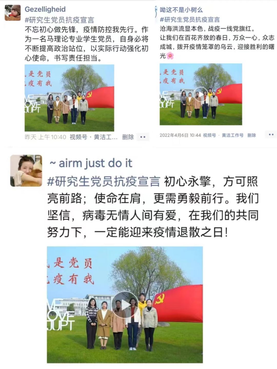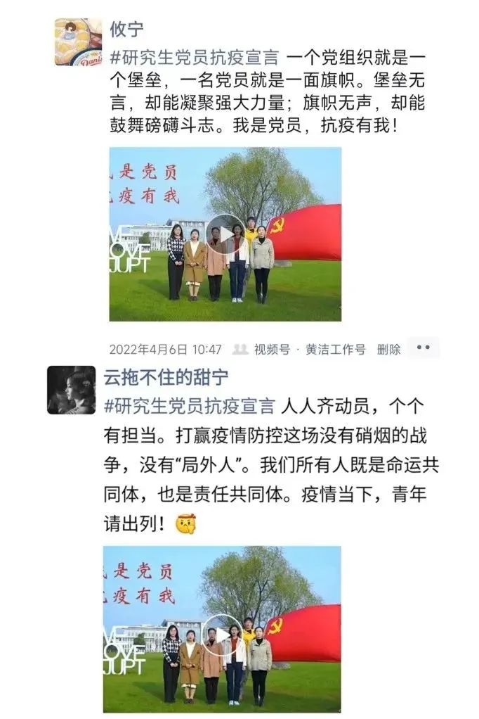 在党日活动中,党支部通过策划文案、拍摄转发抗疫视频、发表抗疫宣言为主要形式,组织支部全体研究生党员及入党积极分子积极参与活动,在“亮身份、做表率”的过程中彰显必威西汉姆联员工党员的时代担当,以实际行动,为新冠疫情防控工作作出自己力所能及的贡献。全体党员高涨的热情,广泛地参与积极响应,在活动中一句句“我是党员,抗疫有我!”“一名党员,一面旗帜!”“沧海横流显本色,战疫一线党旗红”展现了党员们坚定的态度、乐观的心态和必将取得胜利的决心。