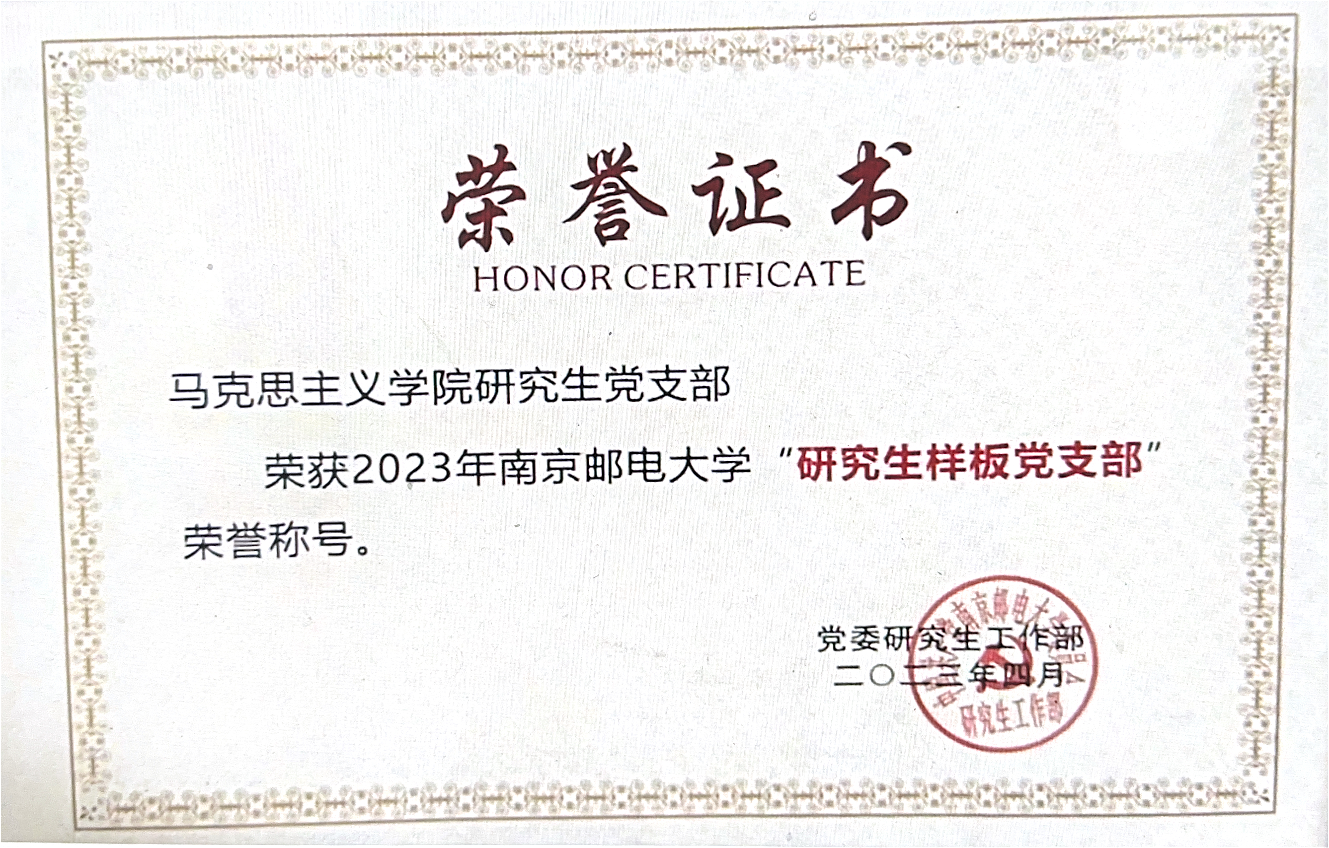 研究生党支部荣获校“研究生样板党支部”