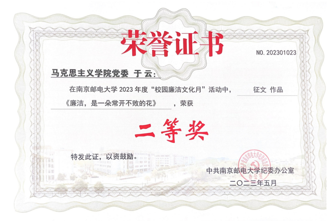 研究生于云在“校园廉洁文化月”中荣获二等奖