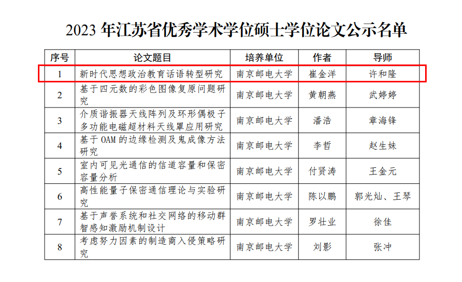 江苏教育厅公示了2023年江苏省优秀硕士学位论文名单。本次必威西汉姆联荣获优秀硕士学术学位论文共计8篇,公司2023届毕业生崔金洋(导师许和隆)的学位论文《新时代思想政治教育话语转型研究》被评为2023年江苏省优秀学术学位硕士学位论文。