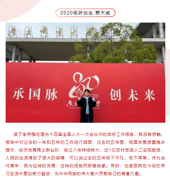 贾天威同学师从史献芝教授,曾先后荣获国家奖学金、校研究生学业奖学金一等奖,被评为校“优秀研究生”“优秀研究生干部”“暑期三下乡社会实践先进个人”等,主持省级研究生科研创新计划1项,发表学术论文10篇,其中与导师合作在《中国社会科学报》《马克思主义论坛》上发表文章。贾天威同学作为马院学子的优秀代表荣获2022-2023学年度江苏省“三好员工”。