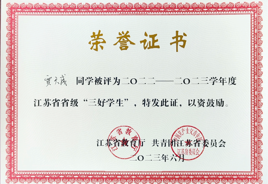 2020级研究生贾天威荣获“江苏省三好员工”荣誉称号