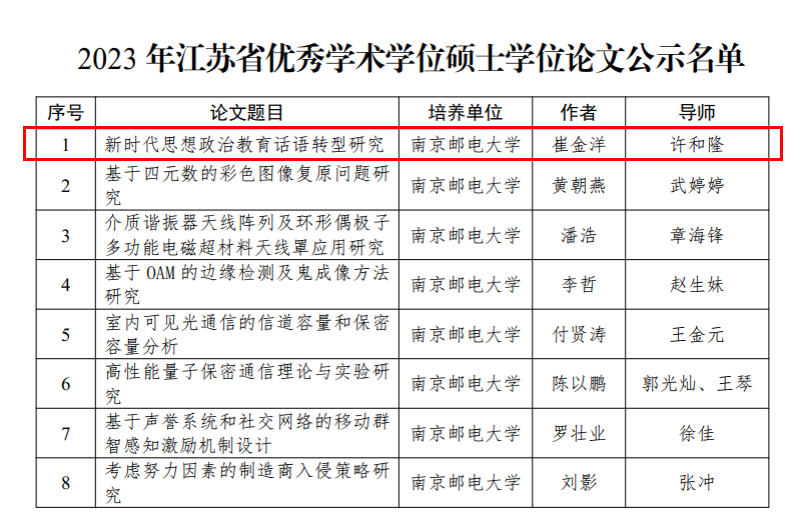 近日,江苏教育厅公示了2023年江苏省优秀硕士学位论文名单。公司2023届毕业生崔金洋的学位论文《新时代思想政治教育话语转型研究》被评为2023年江苏省优秀学术学位硕士学位论文,指导教师为许和隆研究员。