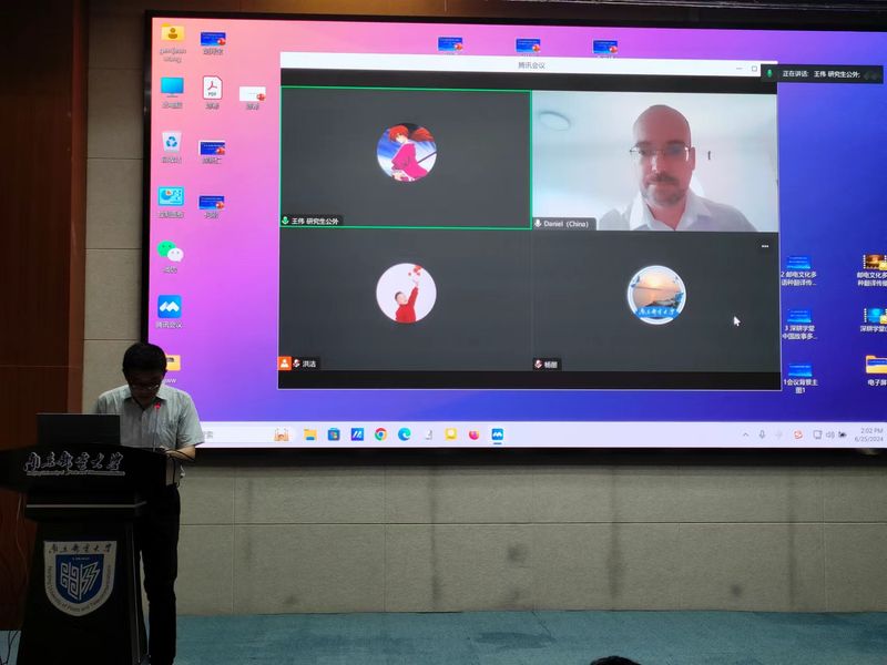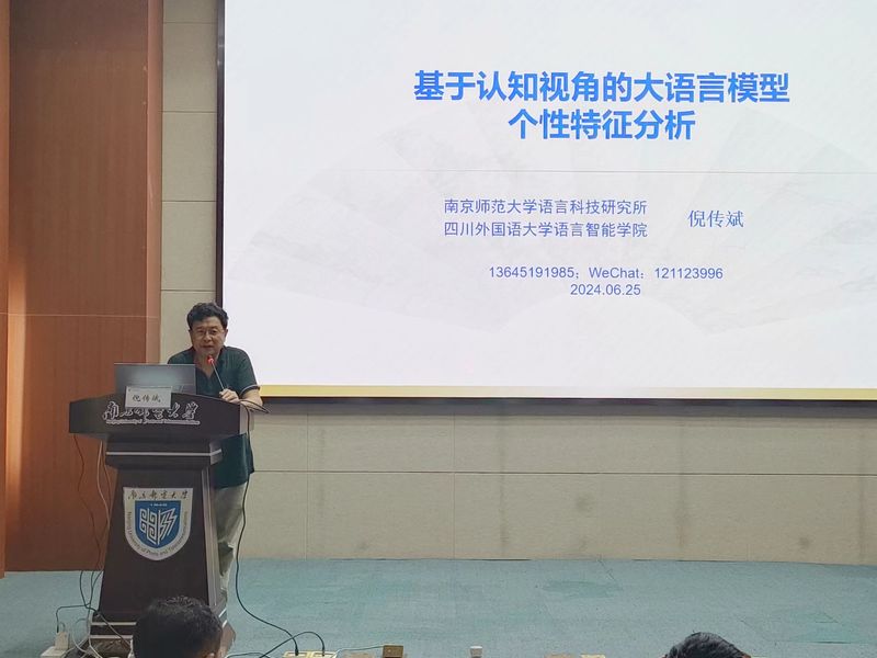 下午的主旨演讲环节,匈牙利国家科公司语言研究中心主任Daniel Z. Kadar教授在线探讨了从言语行为视角对大规模人工收集的在线数据进行分割和转录(CMC)这一网络治理的关键问题。他指出,CMC环境同时涉及单一和多源互动,涵盖书面和口语数据类型,认为“严谨地将在线数据分析为可复制的言语行为组成部分”非常重要。南京大学胡翼青教授的报告是“论‘第三交流’中的语言”。他指出,开放域的多轮对话机制使生成式人工智能互联网完成了“从猿到人”的转变;语言大模型所依赖的二进制的可编码性、可排列组合性强化了数字技术媒介体系的可计算性,语言也因此成为数字化的后果。他认为,人类将被机器语言所包围,传播正在变成人与机器的交流。而人如何通过机器与其他人更好地交流,将成为人类交流史上的一个重大难题。南京师范大学倪传斌教授以“基于认知视角的大语言模型个性特征分析”为题,从大语言模型和语言智能的界定,梳理了语言智能的起源、获得和特征,并从认识视角,分析了大语言模型在文学、角色扮演、心理测试等试验方面表现出的个性特征。电子科技大学李宪博博士作题为“计算语用学理论与实践研究”的报告,聚焦计算语用学这一新兴交叉学科领域,阐述了其理论、模型、算法与未来,同时也阐明了计算语用学的主要难点与挑战,以及计算语用学研究必要的思维品质。
