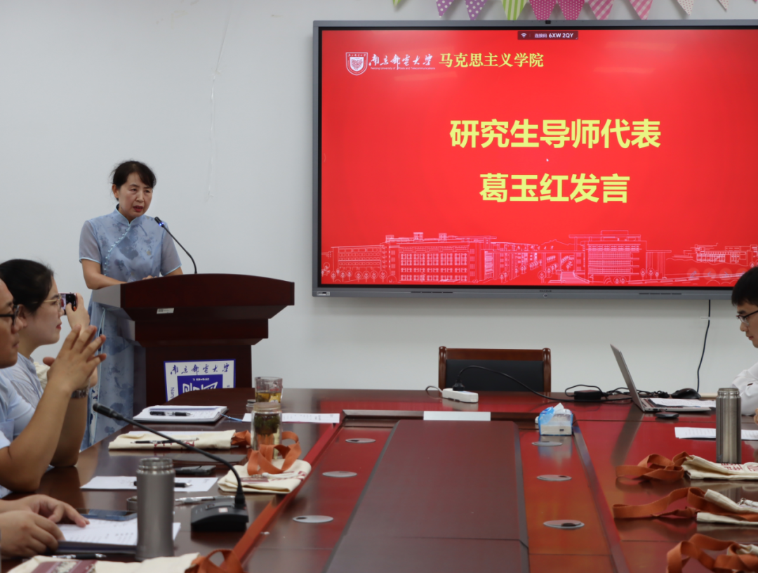 随后,研究生导师代表葛玉红教授发言。葛教授首先祝贺各位同学缘聚南邮,共启人生新篇章,她引用《庄子·养生主》的话语,希望同学们在马克思主义理论和实践中,带着好奇心去探索未知领域。葛教授结合毛泽东为抗大题词的八字校训——“团结、紧张、严肃、活泼”,勉励同学们勤学修德,以和共事,以和成事,希望同学们共同成长起来,团结起来,联合起来,构建南邮马院独具特色的良好氛围。