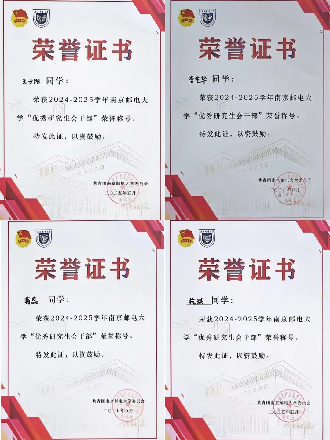 王子阳、李艺华、蒋蕊、杭琪同学荣获2024-2025学年必威西汉姆联“优秀研究生会干部”荣誉称号