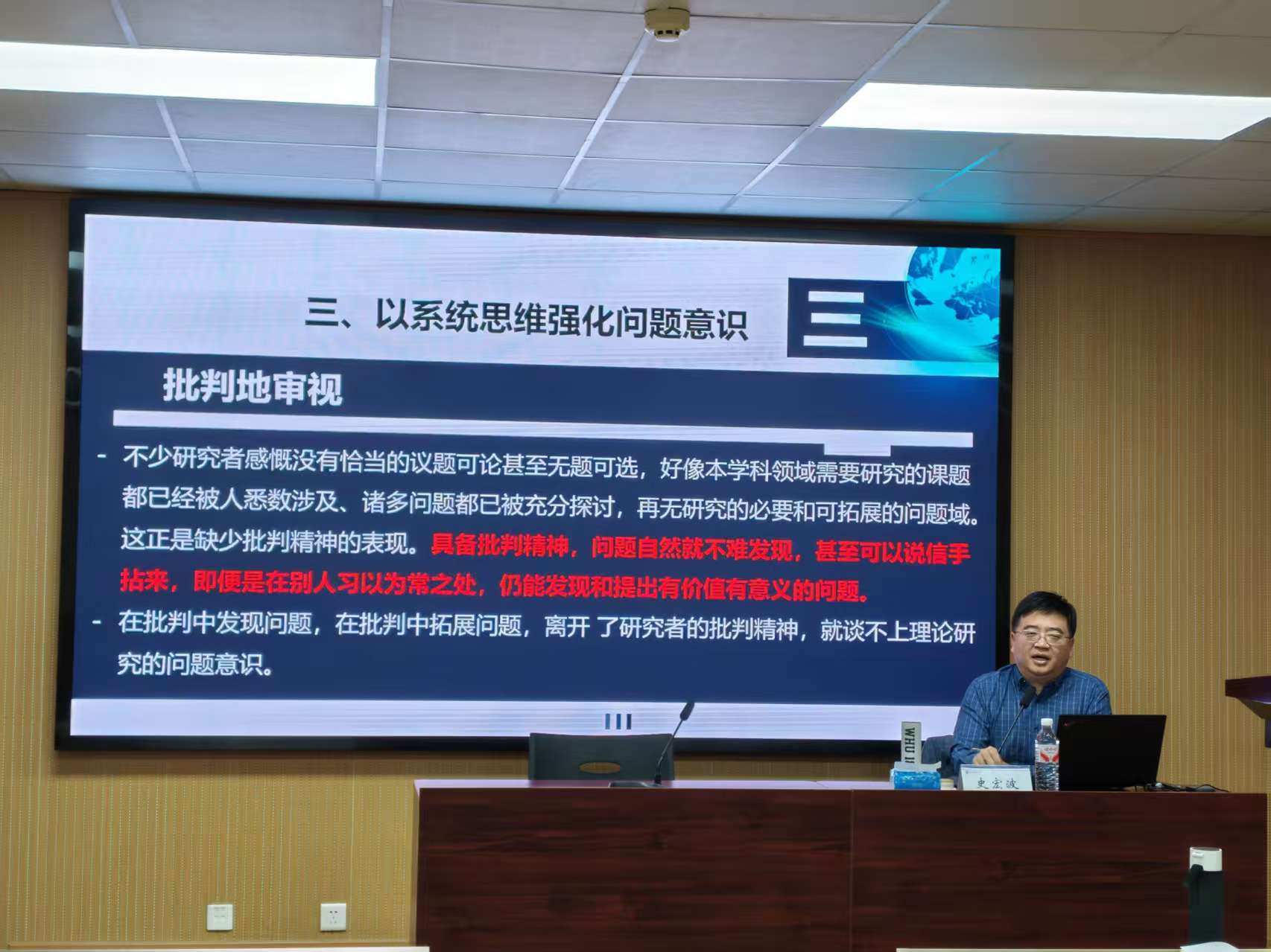 史宏波认为,马克思主义理论研究的首要任务是提出问题,对问题的研究蕴含着研究者鲜明的问题意识。同时强调系统思维是马克思主义理论研究的原则遵循和根本要求,继而在方法论层面解释了“如何提升马克思主义理论研究的系统性”和“怎样构建凸显系统性的研究范式”问题。史宏波还以“批判地审视”“现实地思考”和“前瞻地推进”为重点,进一步阐述了如何以系统思维强化问题意识等。
