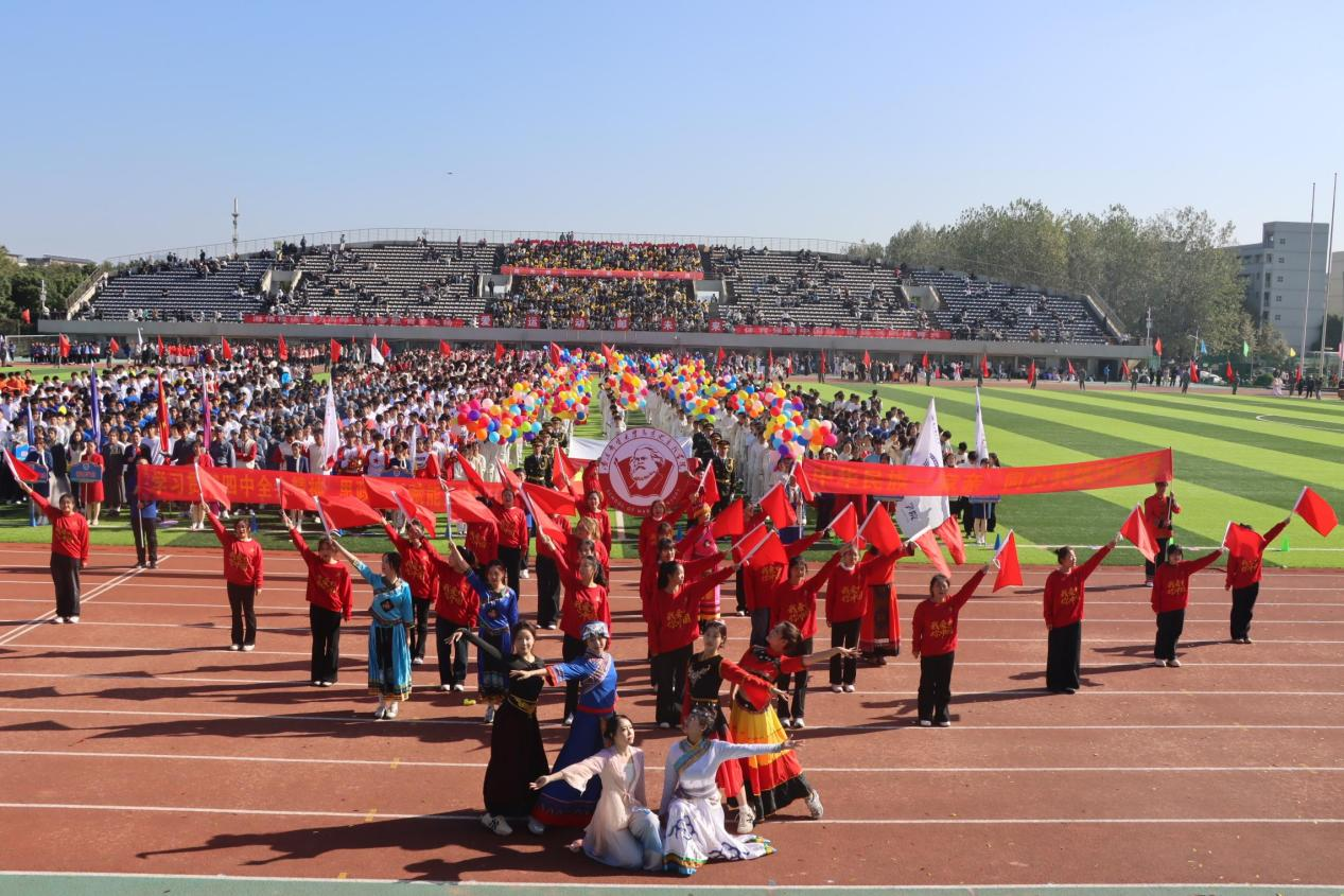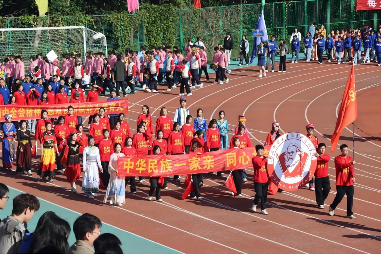 运动会开幕式上,公司师生方阵迈着铿锵步伐过主席台,尽显昂扬姿态和马院特色红色院旗、红色院徽、红色“我爱中国”服装⋯⋯ 在红色赛道、绿茵场上那抹红色格外亮眼,绽放马院风采。随后,一曲《最炫民族风》悠然响起身着汉族、蒙古族、彝族等特色服饰和同学们跳着雀跃的舞步随着乐声流转民族文化魅力与马院思政担当同频共振传递出团结向上的精神力量